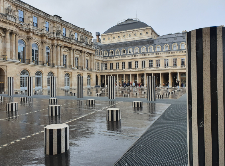 The Versailles‑style garden, listed as a “remarkable garden”, covers over 20,000 m² with lush lawns, fountains, flowerbeds and sculptures. It is a green haven much loved by Parisians and visitors alike. At its heart stands Daniel Buren’s iconic artwork “Les Deux Plateaux”, or Buren’s Columns – 260 octagonal black-and-white marble columns of varied heights (8.7 to 62 cm), some emerging from a subtle water basin. Installed in 1986 within a former parking area, what was initially controversial is now a beloved symbol of the Palais‑Royal.