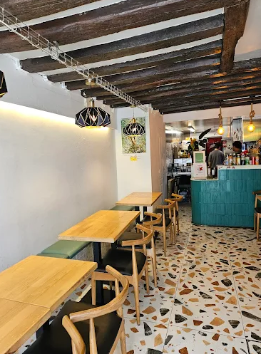 The ambiance is warm and relaxed, with soft lighting, wooden furnishings, communal and individual tables, plus a small terrace for sunny days. The multilingual staff (French, English, Chinese) caters to diverse audiences—students, families, spice-lovers, and groups of friends.